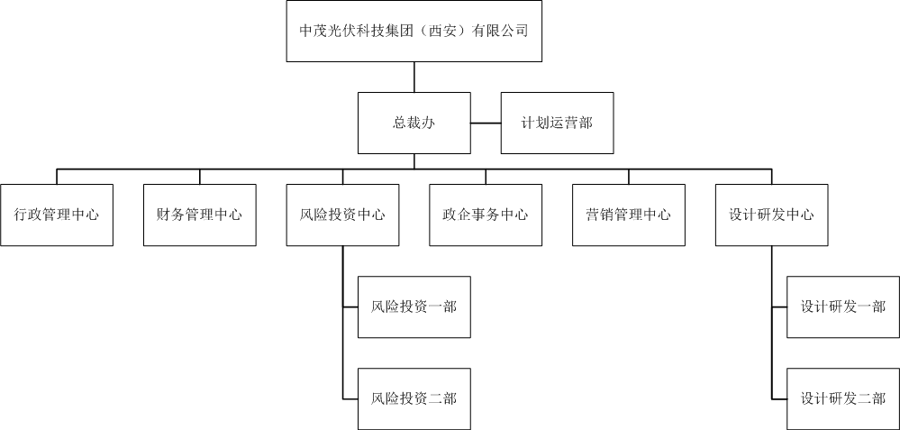 公司由法定代表人担任总裁,下设总裁办、行政管理中心、财务管理中心、风险投资中心、政企事务中心、营销管理中心、设计研发中心,6个部门以及1个生产加工基地,由总裁负责公司的整体运营。