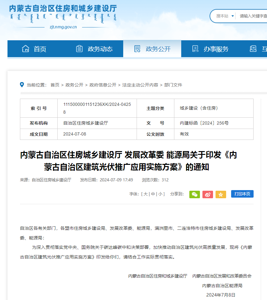 内蒙古自治区住房城乡建设厅、发展改革委、能源局联合印发《内蒙古自治区建筑光伏推广应用实施方案》。