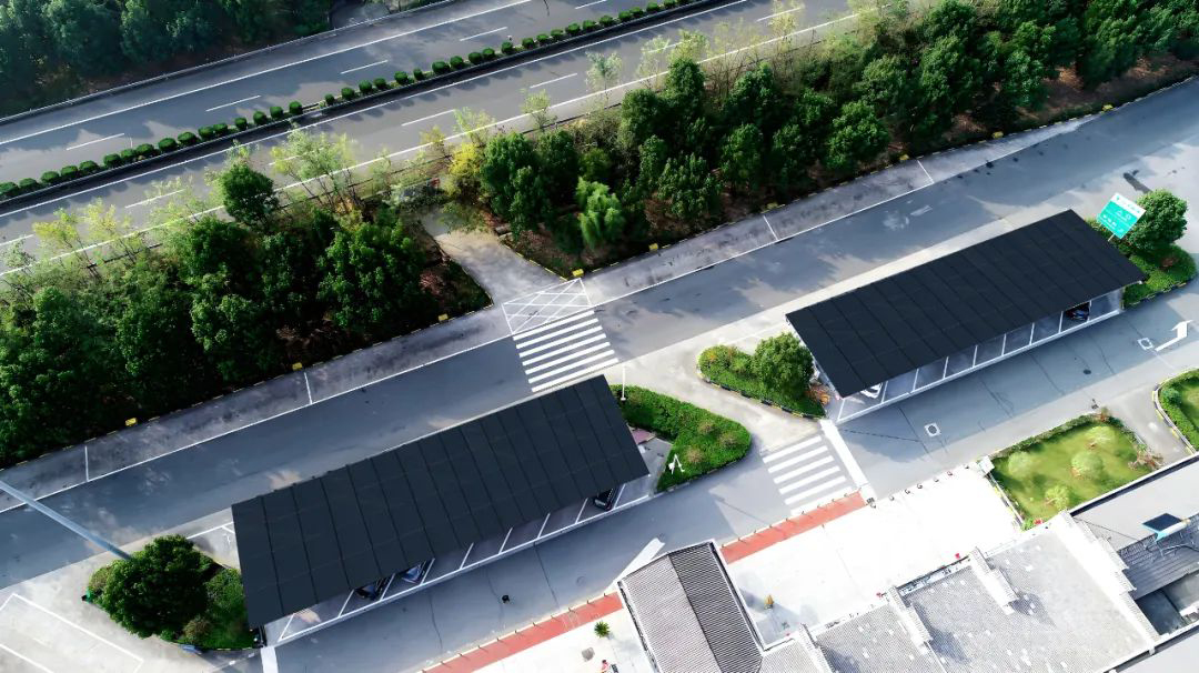 造型美观:使用光伏组件替代传统车棚的膜结构钢顶,深色的光伏电板在阳光下熠熠生辉,增添了一道亮丽的风景。