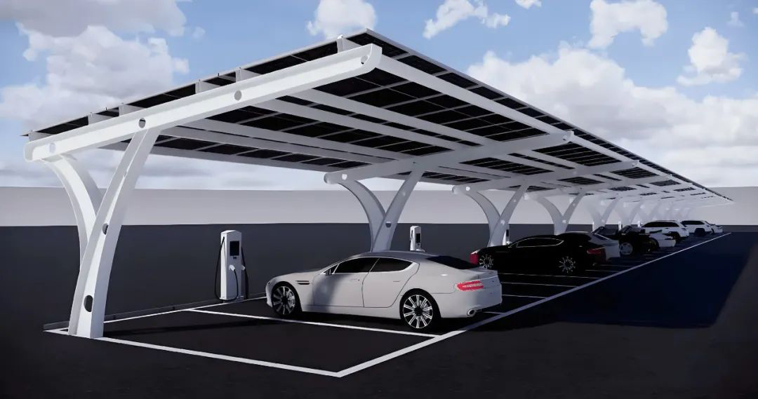在快速发展的现代社会中,随着新能源汽车数量的激增,停车难、充电难的问题日益凸显。与此同时,太阳能光伏技术作为一种清洁、可再生的能源形式,正逐步融入我们的日常生活。“光伏+车棚”作为一种新型分布式光伏项目,一种光伏与建筑相结合中最为简便易行的方式,以光伏组件代替传统车棚顶面,实现发电功能的同时,还能起到遮阳防雨的作用,同时能明显降低车棚下车辆的温度。在工厂园区、商业区、医院、学校等场景中有着广阔发展前景。