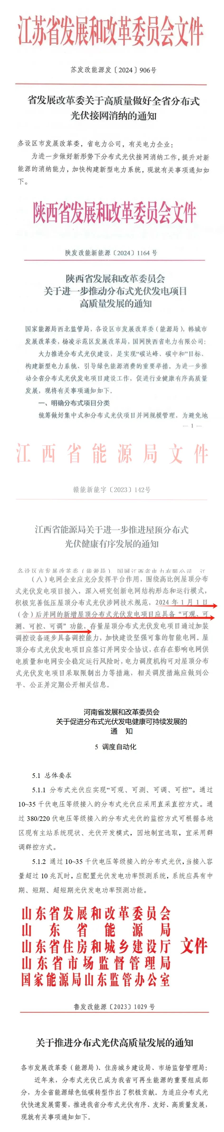 2023年下半年开始,多个省份开始要求,新建分布式光伏项目,应具备:“可观、可测、可调、可控”功能(以下简称“四可”功能),据不完全统计,目前,江苏、陕西、江西、河南、安徽、山东等多个省份,对分布式光伏均有“四可”功能的要求。可以预期,落实分布式光伏电站“四可”功能,将成为分布式光伏技术发展的新趋势。